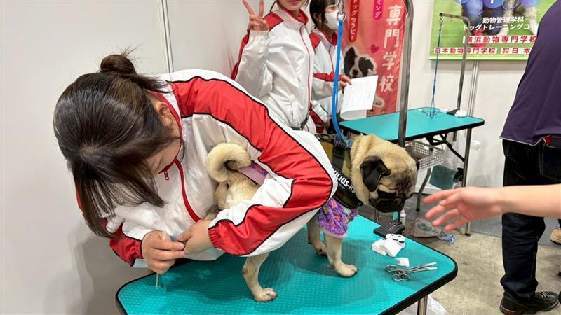 本校のトリミングブースでは学生たちが飼い主様のそばでワンちゃんをお預かりし、爪切り・耳掃除・ブラッシングを担当しました。緊張しながらも、楽しそうに取り組む姿が印象的でした。